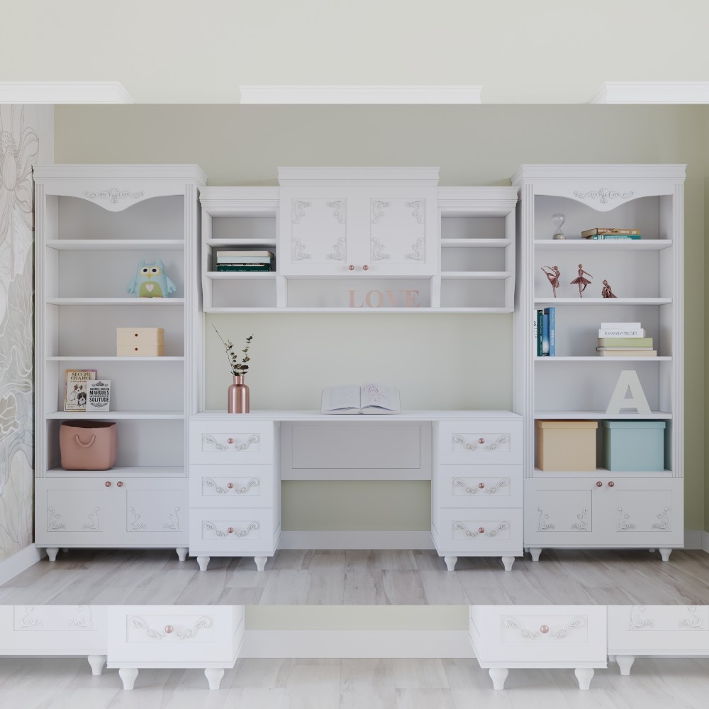 Flower – ніжна та світла спальня для дівчинки, у якій гармонійно поєднуються комфорт, функціональність та естетика. Дизайн натхнений природою та квітковими мотивами, що створює затишну й спокійну атмосферу, сприятливу для відпочинку та розвитку.