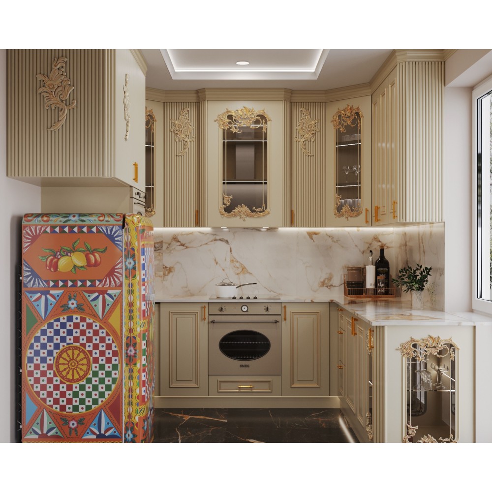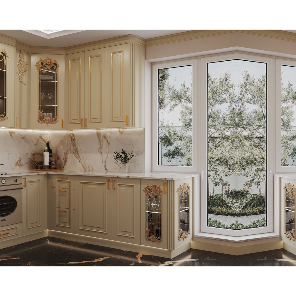 Ця кухня — справжній витвір мистецтва, виконаний у білосніжному кольорі, що підкреслює її чистоту та стиль. Стримана елегантність стилю Art Deco оживає в кожному фасаді завдяки витонченому різьбленню, яке додає інтер’єру глибини та індивідуальності.