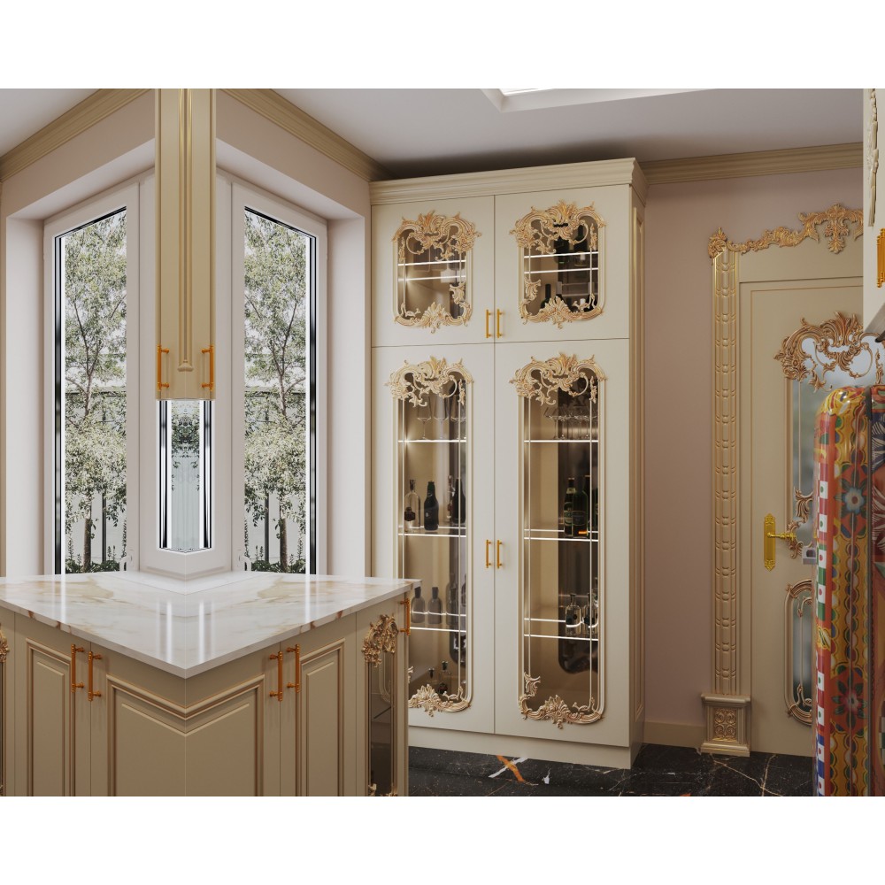 Особливу увагу привертає шафа зі скляними вставками, виконаними у цікавому дизайні — ідеальне місце для демонстрації улюбленого посуду або келихів, що створює атмосферу домашнього затишку та елітарного смаку.